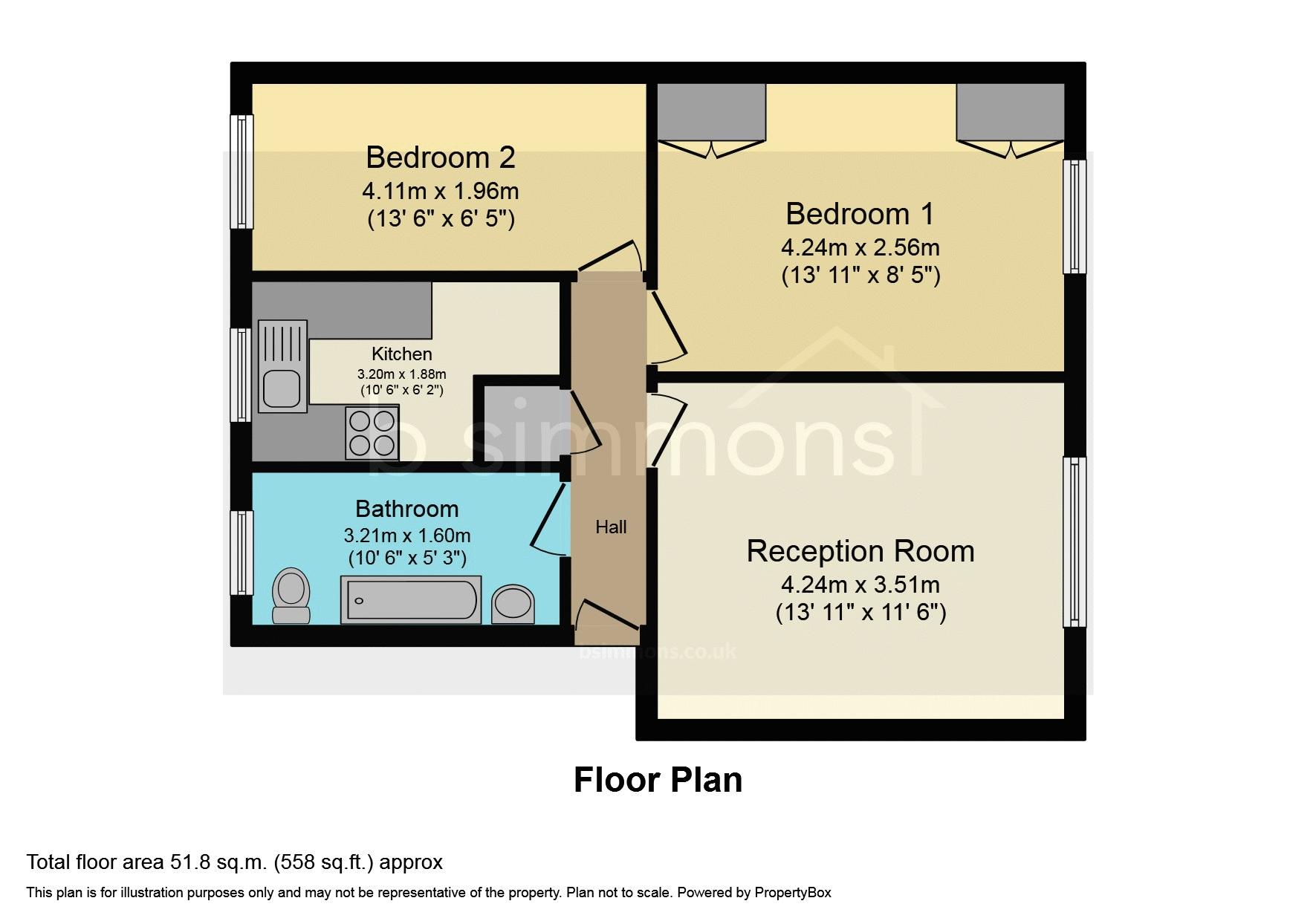 The property boasts having two good sized bedrooms, the master having built in wardrobes, an open plan living/dining room, there is a modern fitted kitchen and family bathroom fitted with a matching white suite and electric shower over the bath. Further benefits of this home include double glazed windows and electric heating throughout.