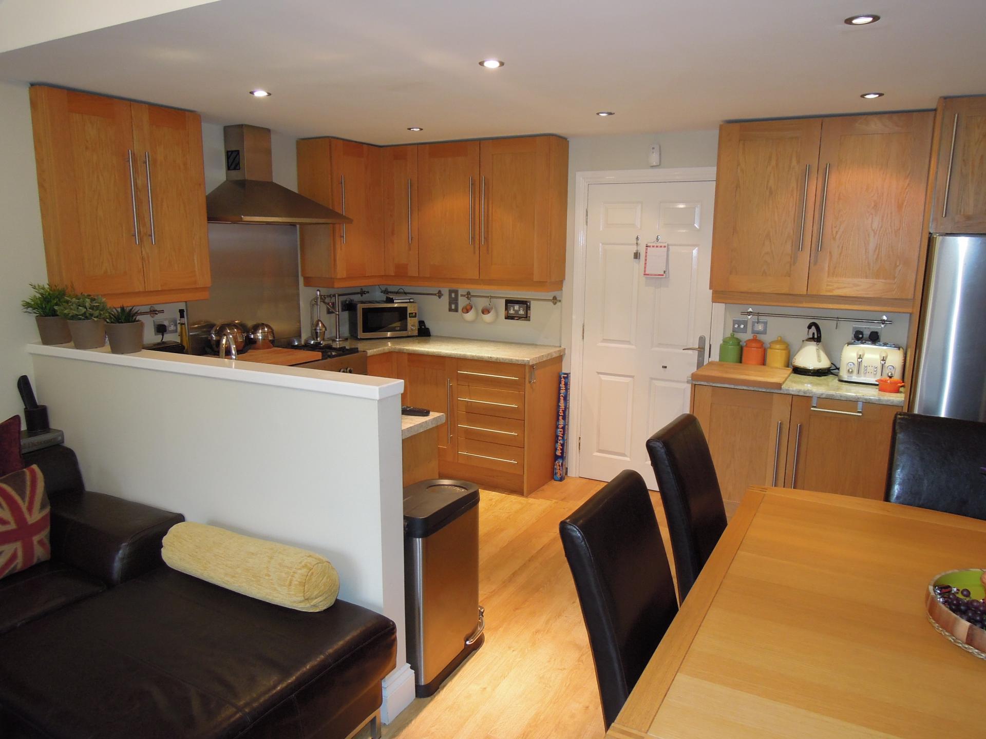 Luxury fitted and comprising of a single drainer sink unit with cupboards below, further range of matching wall and base units, contrasting laminated work surfaces, laminated wood flooring, power points.