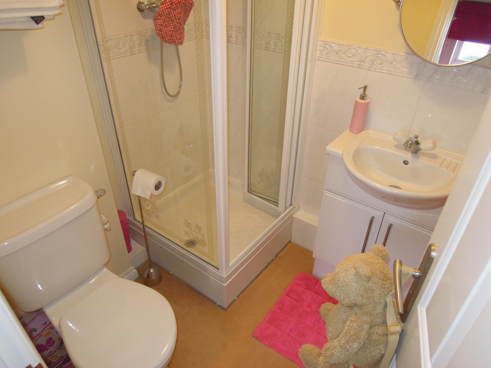 Comprising of an independent shower cubical. low level WC, wash hand basin, tiled floor, heated towel rail.