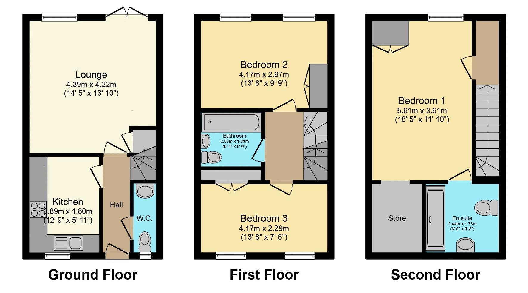 comprising a spacious lounge with storage space, a modern fitted kitchen with appliances and a downstairs cloakroom on the ground floor. There are two double bedrooms with built-in wardrobes and a stunning modern three-piece family bathroom on the first floor. The 2nd floor boasts the large principal bedroom which has built-in wardrobes, a large three-piece en-suite shower room and a spacious plant room housing the water tank and providing additional storage.