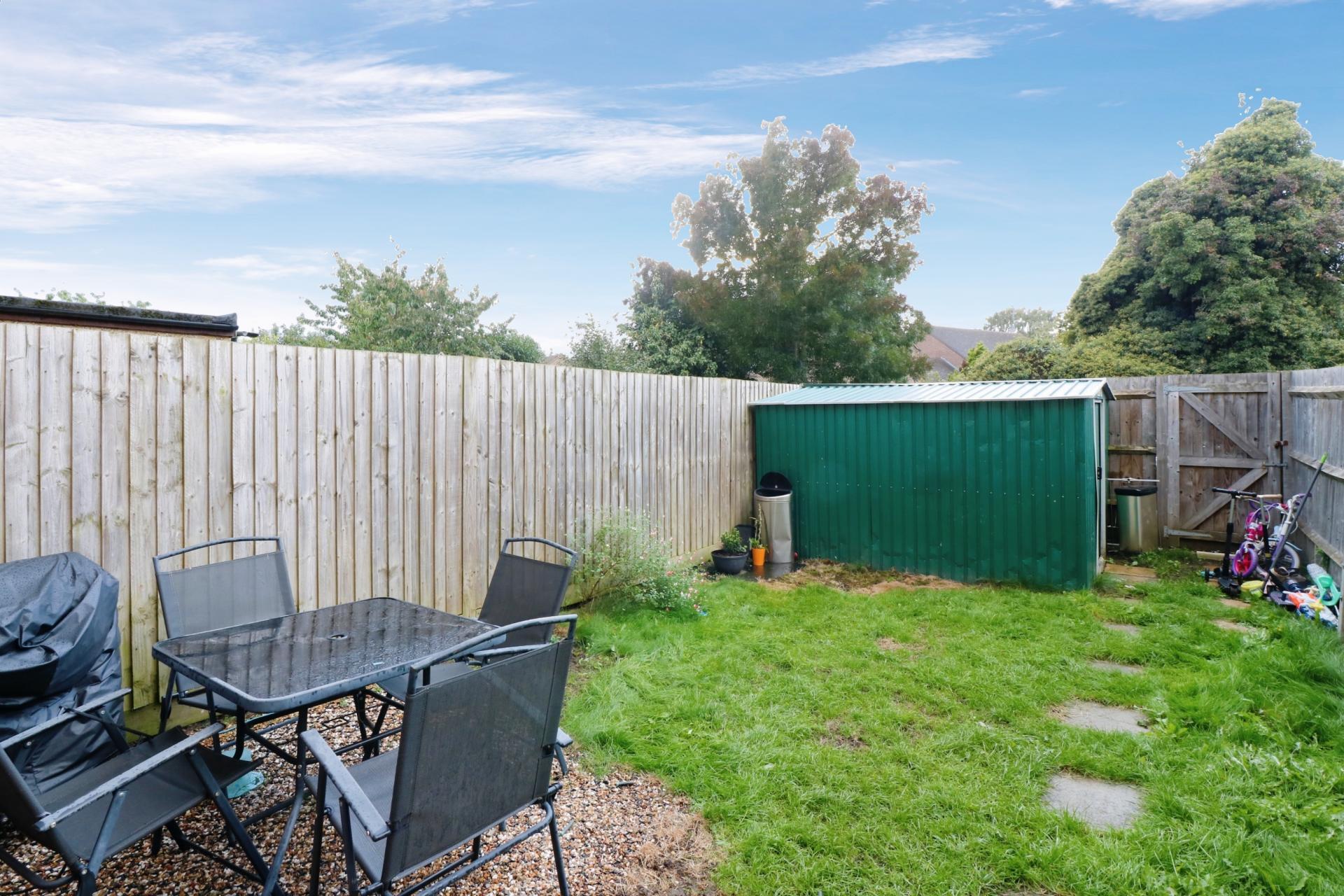 The property further benefits from a private and enclosed rear garden with patio but mostly laid to lawn, with a large metal shed and rear access via a back gate. The property also comes with 2 allocated parking space, whilst there are many visitor bays and ample on street parking for visitors or additional cars.