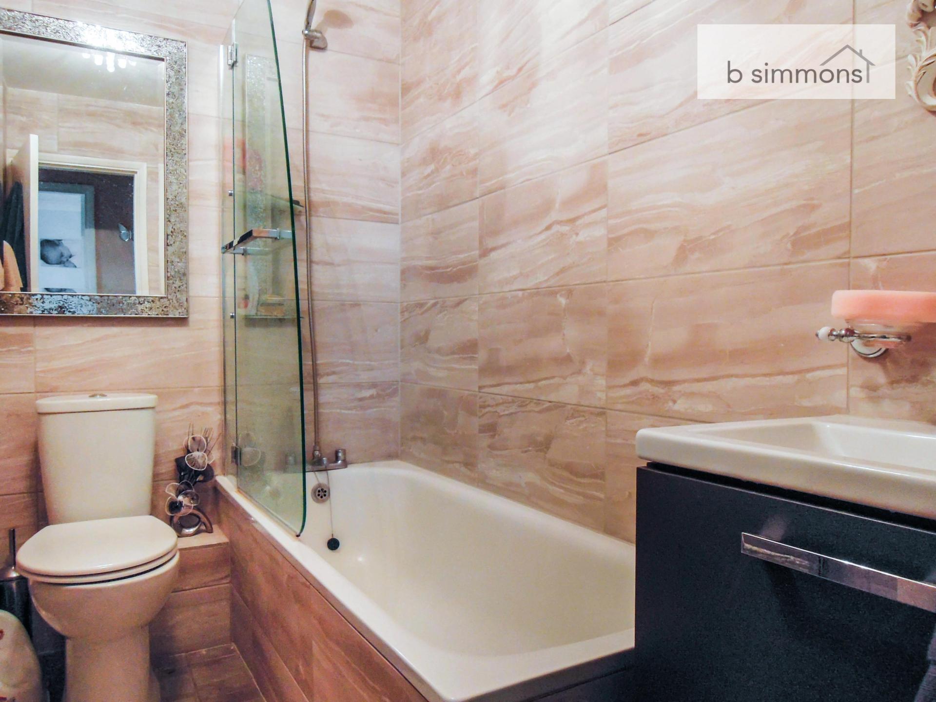 Tiled walls & floor, enclosed bath with shower attachment, low level W.C, wash hand basin. Heated towel rail, extractor fan.