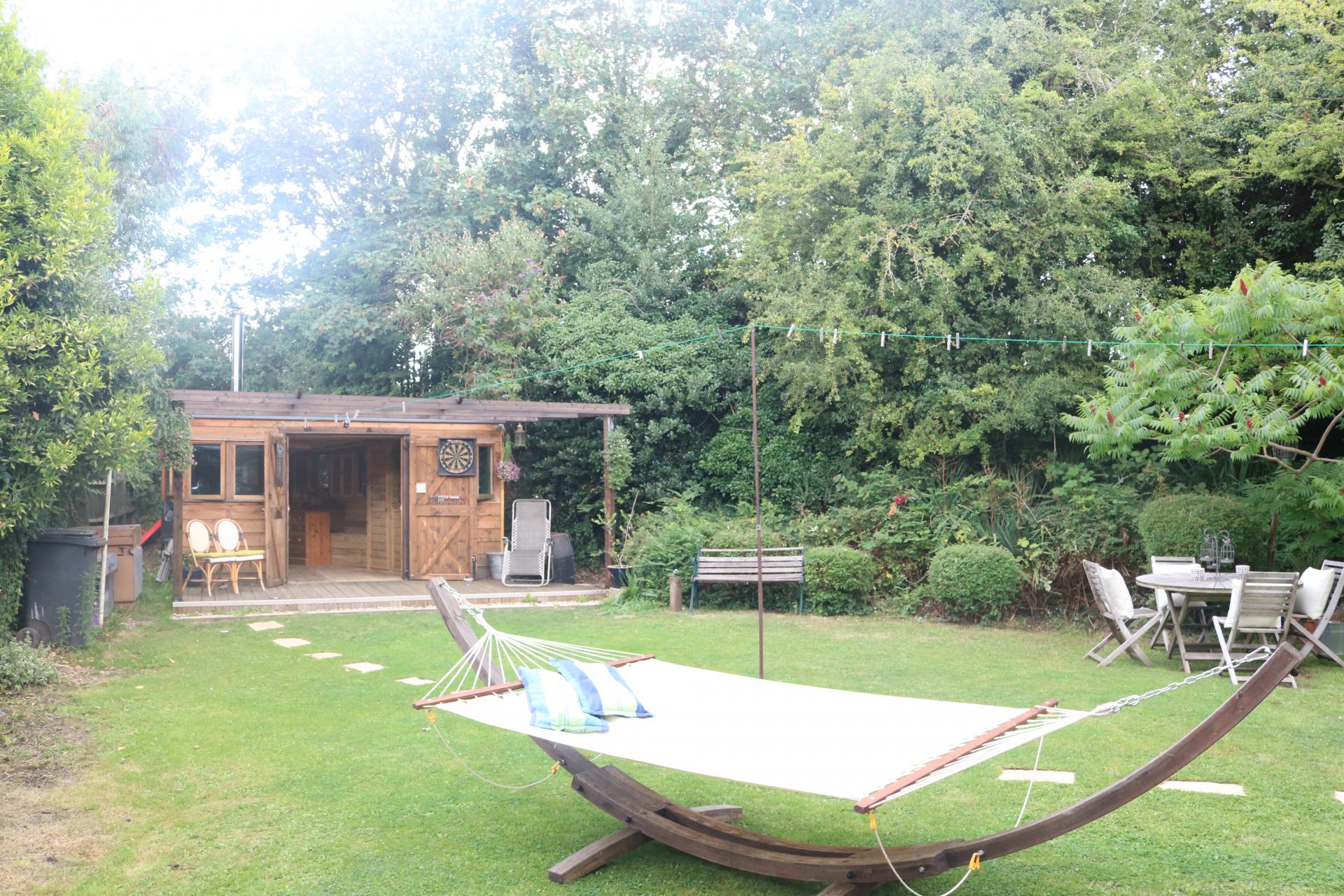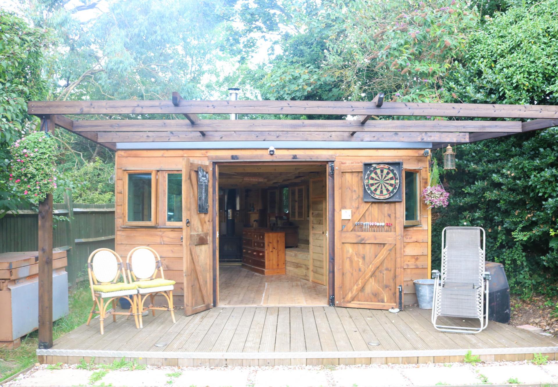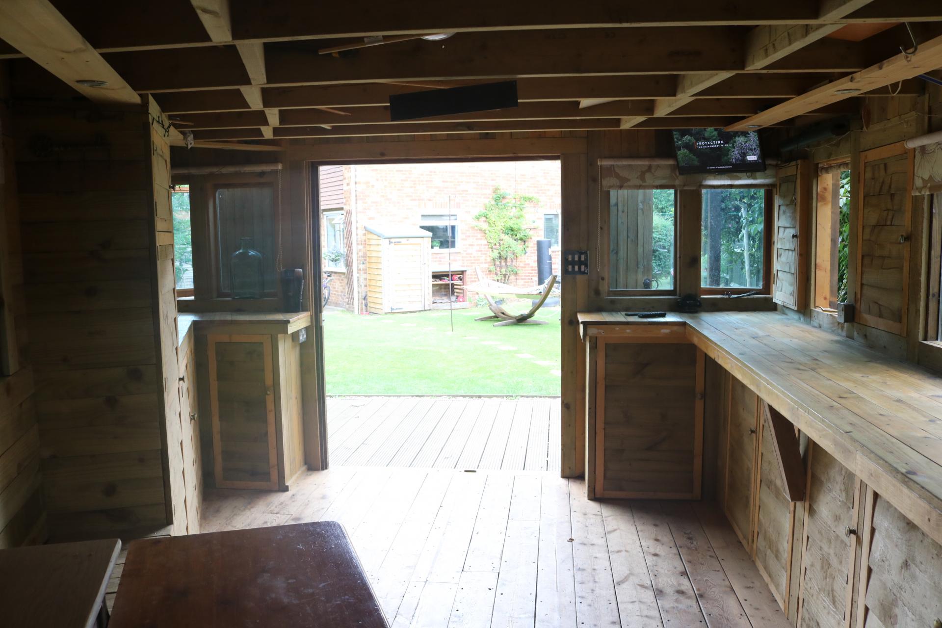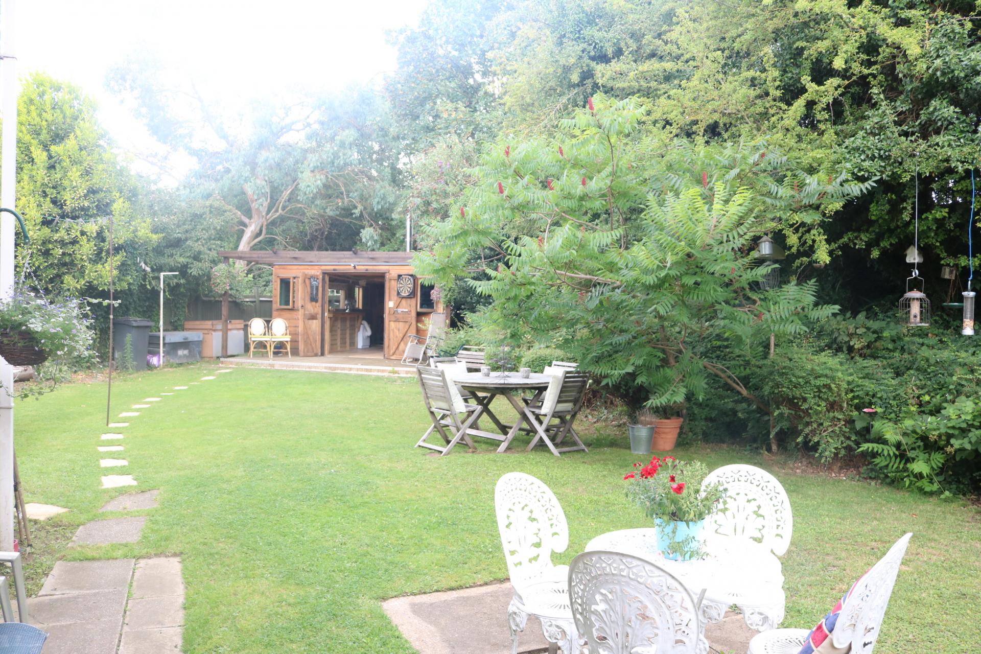 Patio doors. Laid to lawn. Large wooden shed.