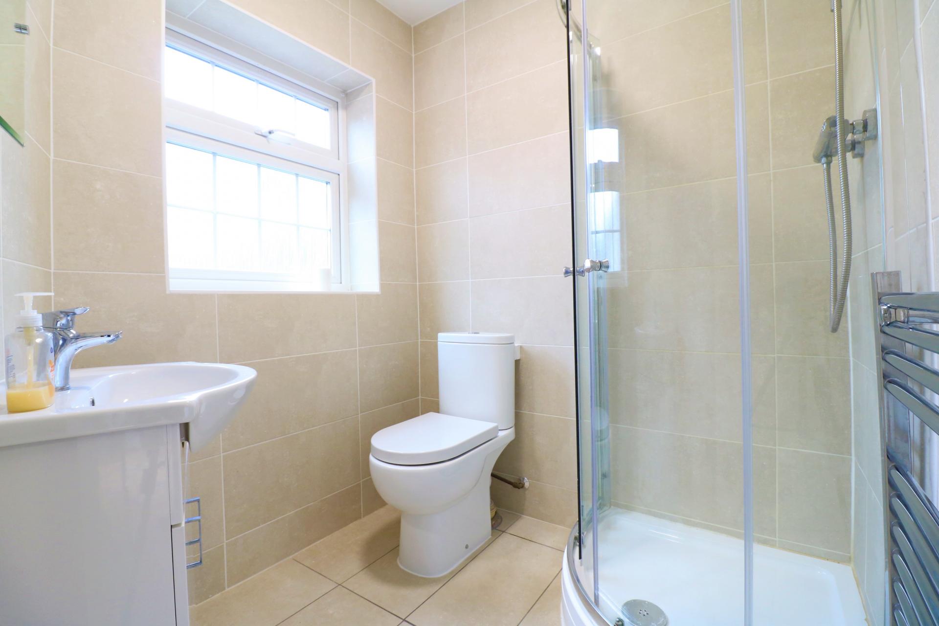 Fully tiled shower room suite. Walk in shower, wash hand basin, WC. Heated towel rail.