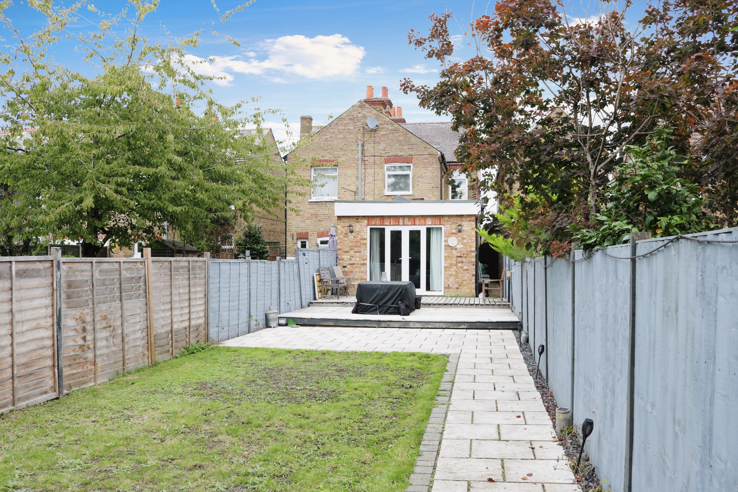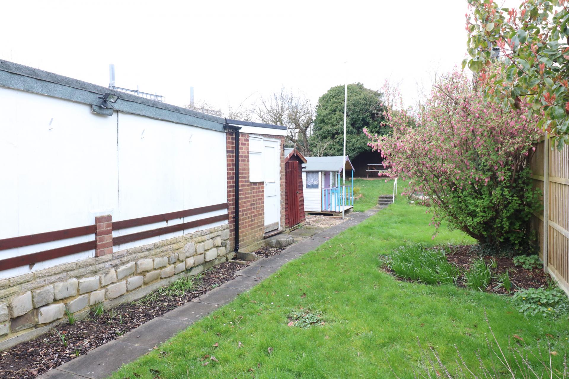 Laid to lawn. Decking area at the rear. Large single story garage.