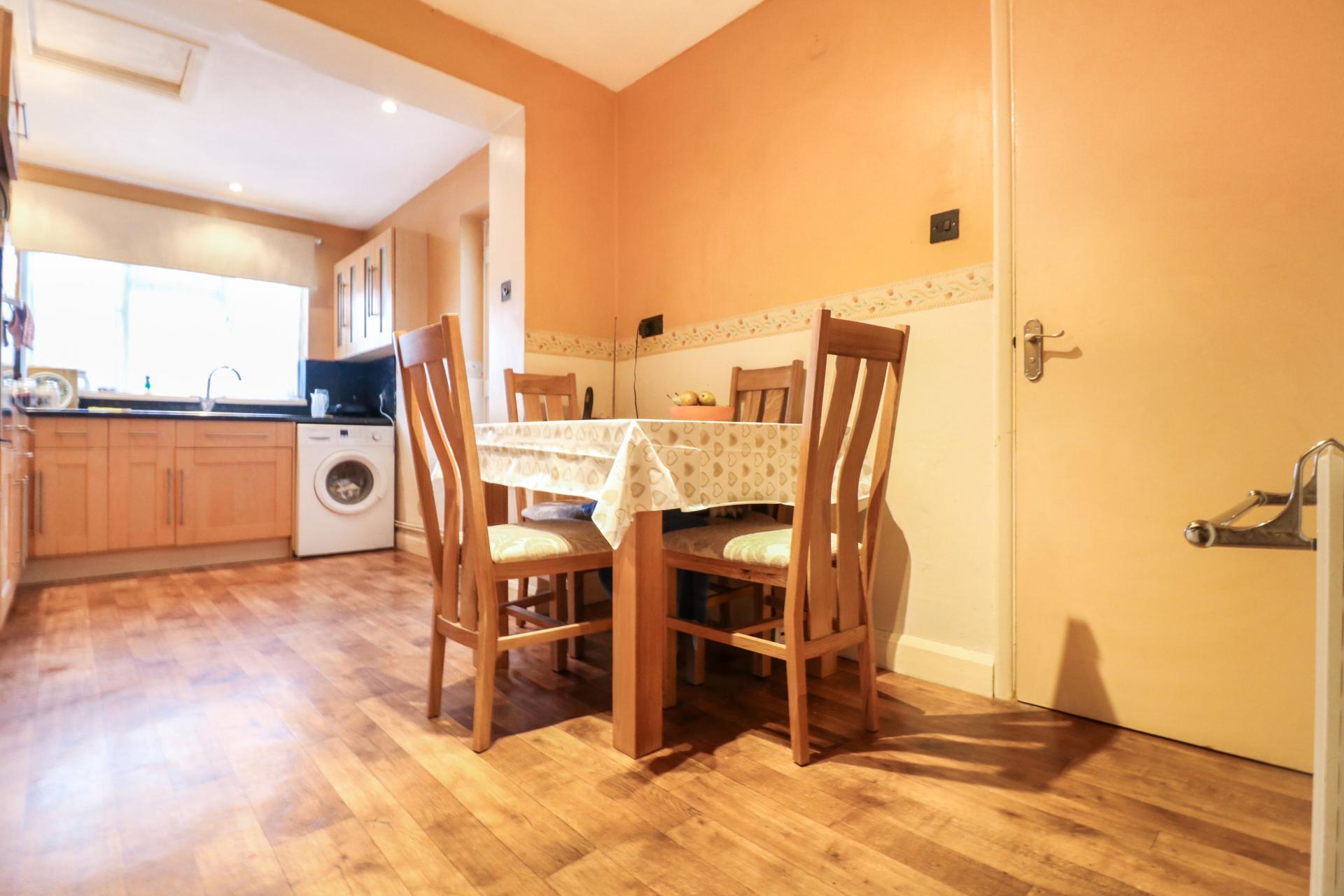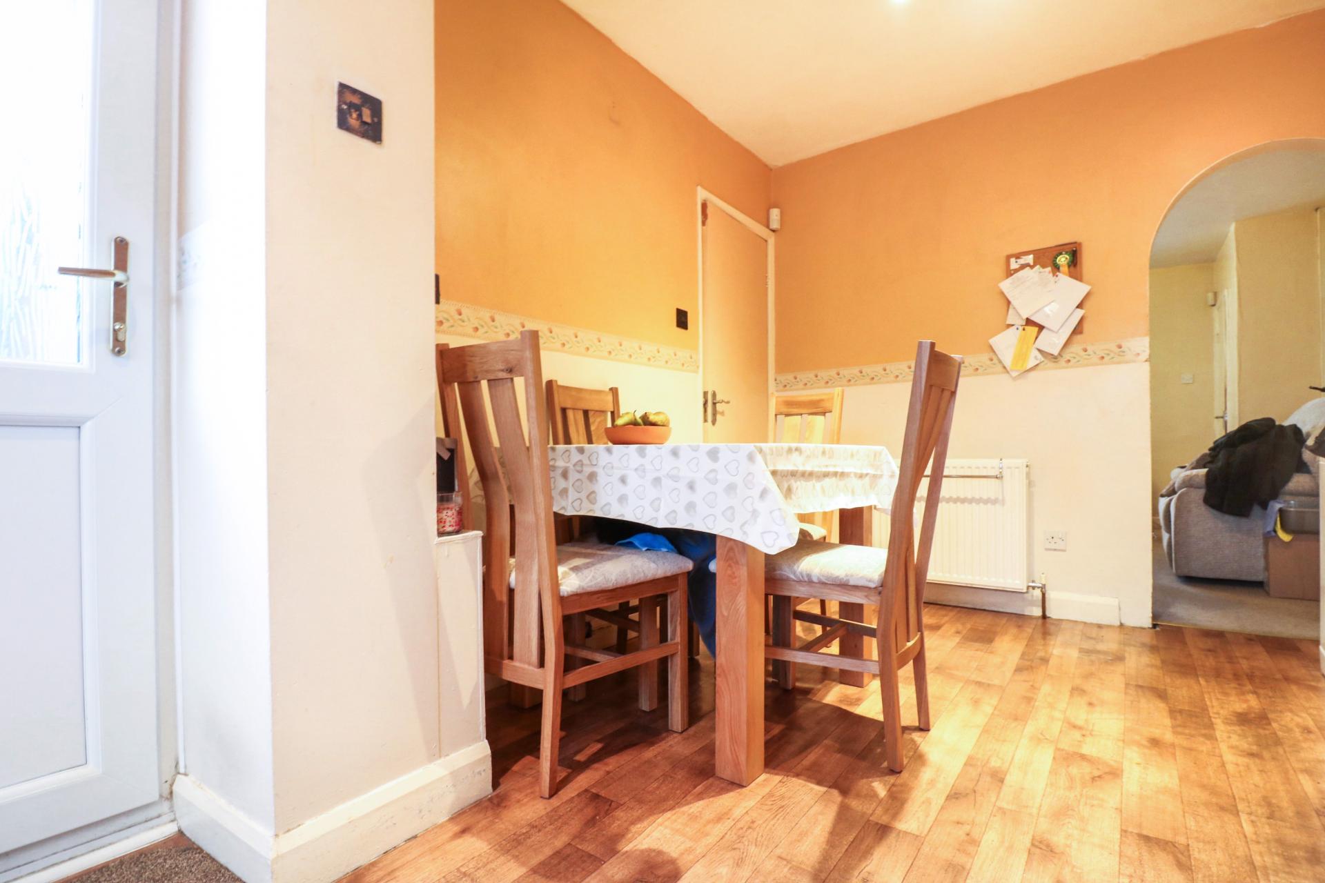 Space for a large dining table. Door leading to bathroom suite and toilet. Space for a fridge and dishwasher.
