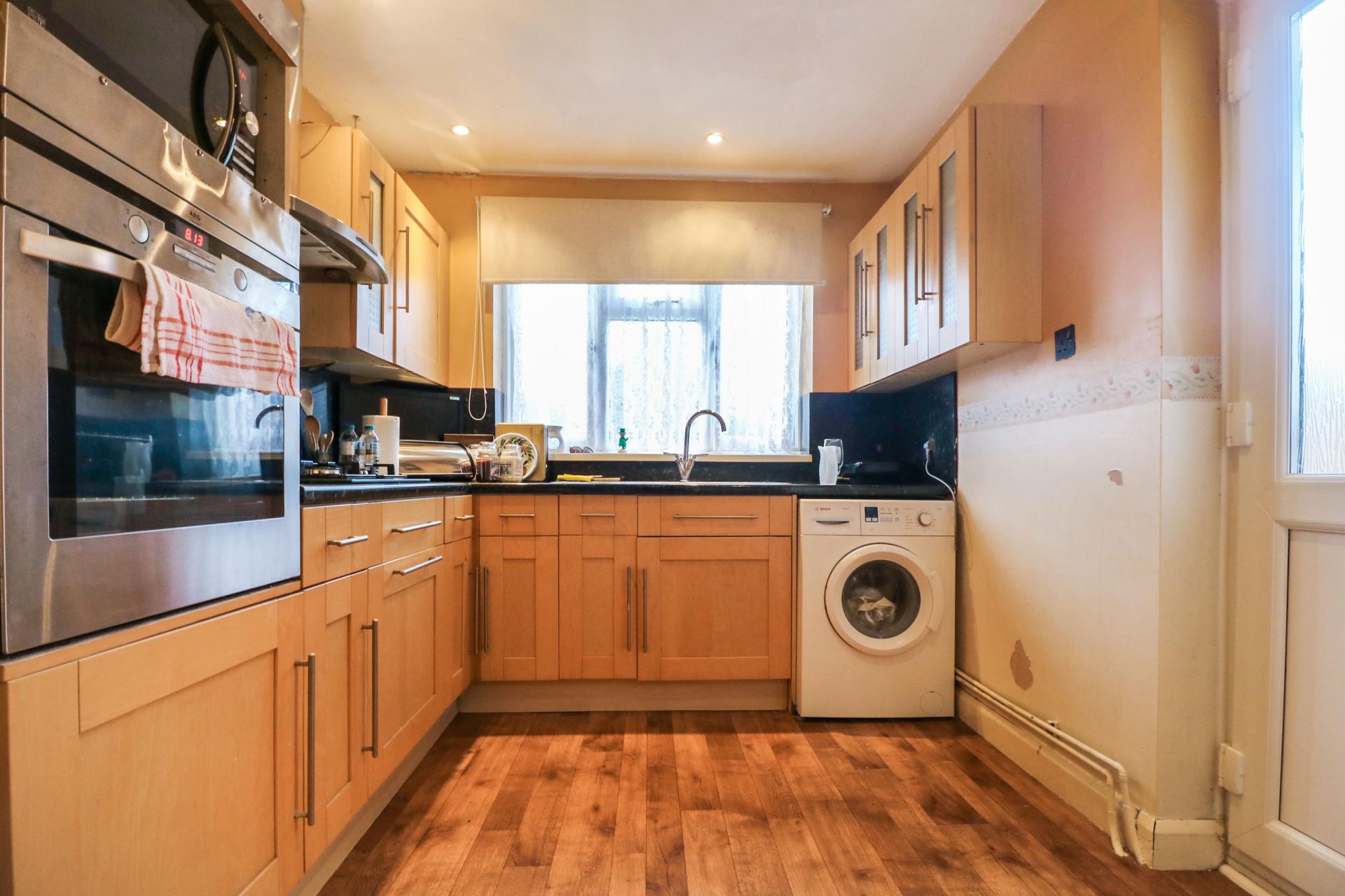 Rear aspect windows. Fitted kitchen, gas hob, integrated oven and microwave. Door leading to rear garden.