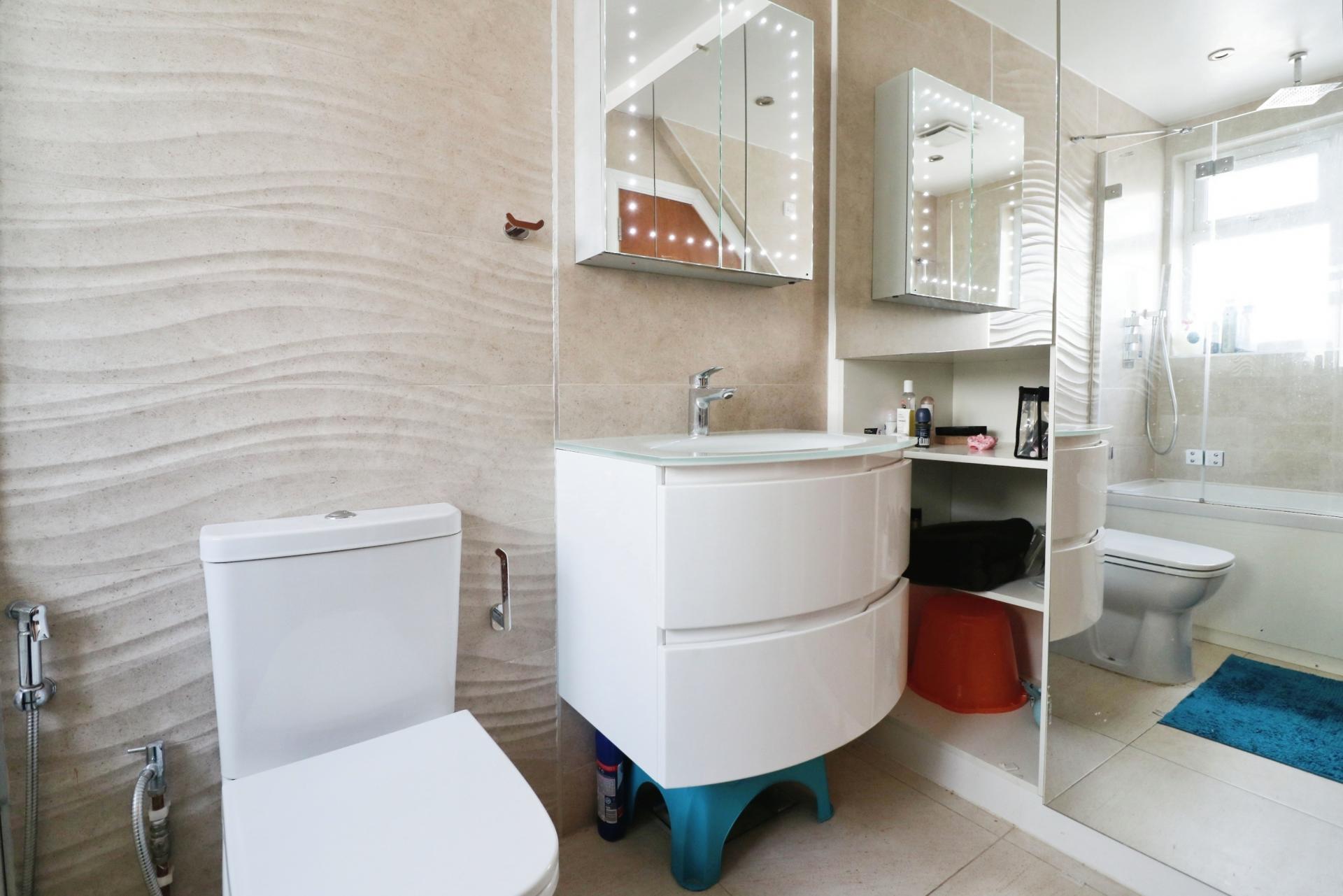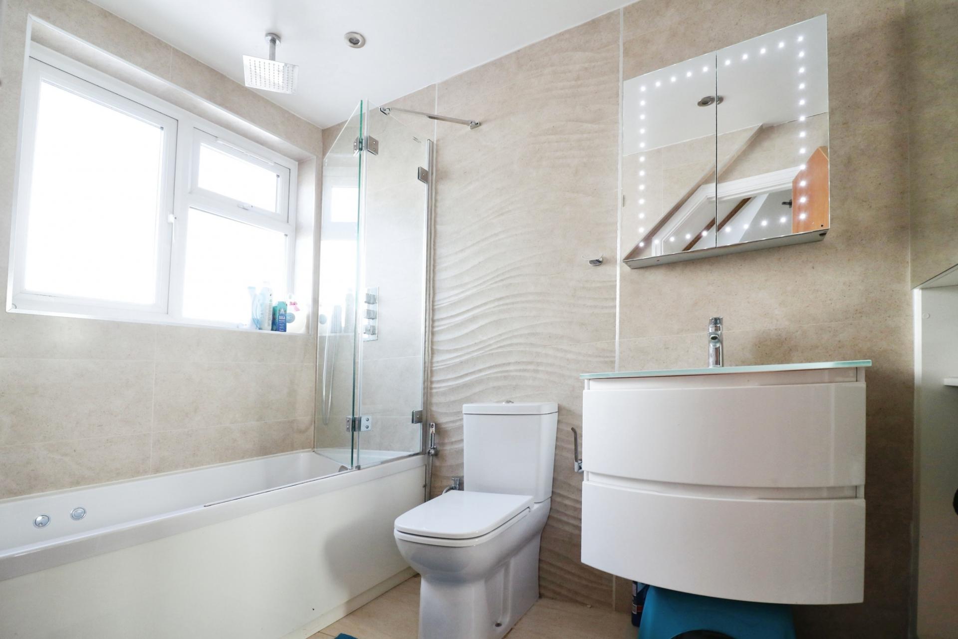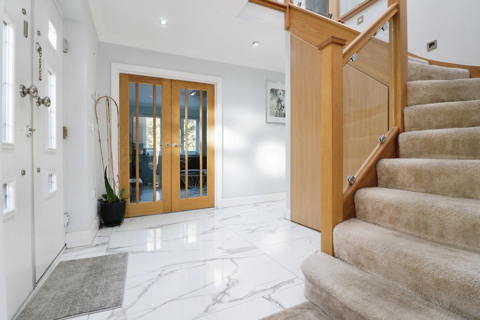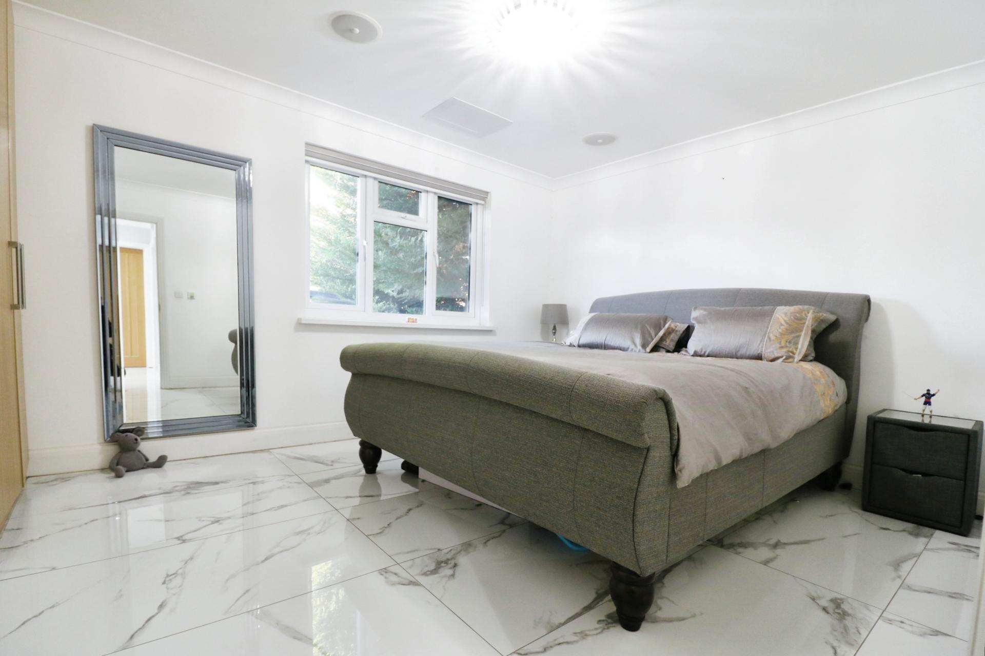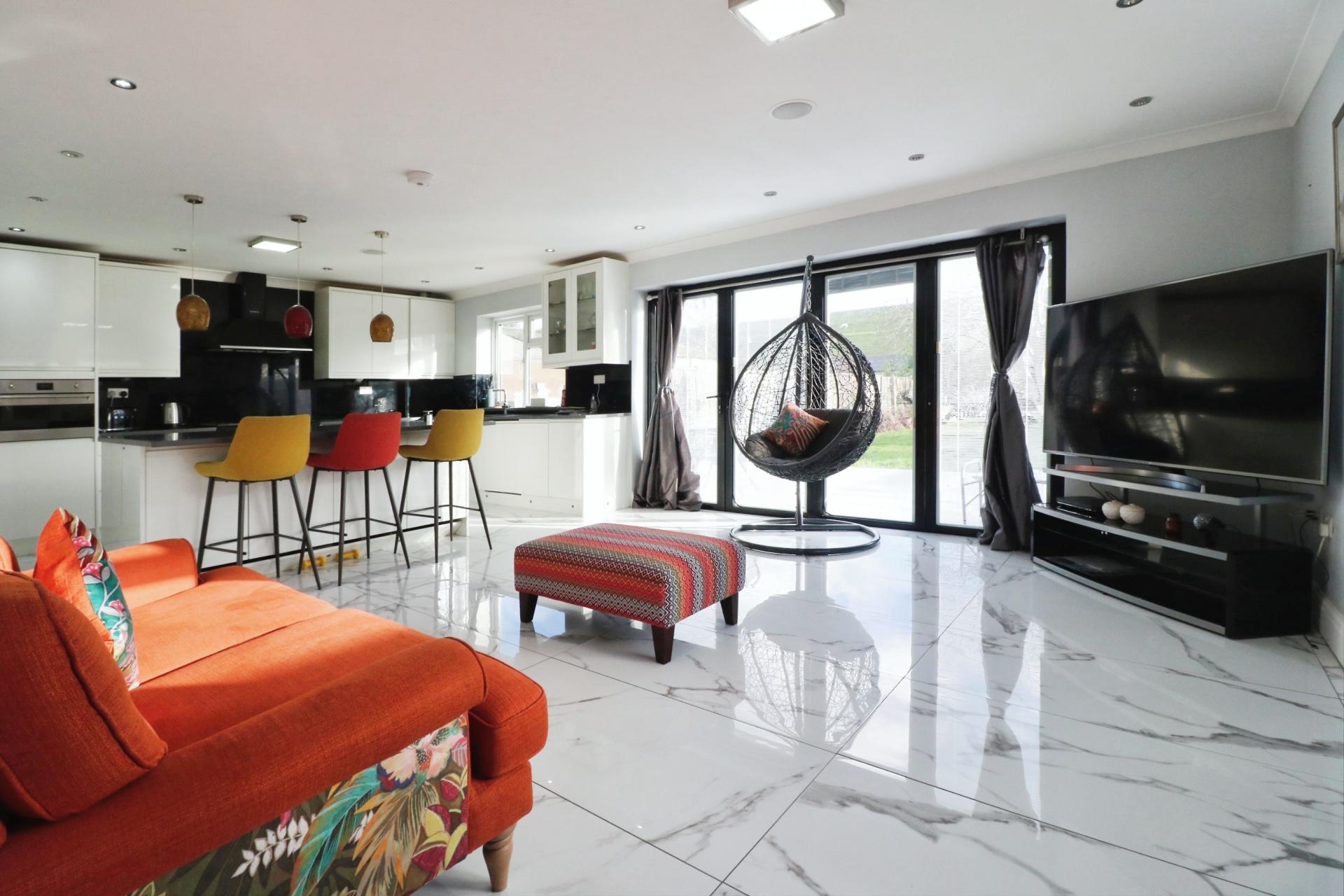As you enter through the front door you walk into a light and airy entrance hallway with stairs leading to the first floor and an understairs storage cupboard. The ground floor has been laid to porcelain style tiles and benefits from underfloor heating with room by room thermostats. The accommodation comprises; a sitting room, a downstairs bedroom with a built in wardrobe, bedroom five/study, a contemporary shower room, and overlooking the rear garden an open plan living room with bi-folding doors, modern fitted kitchen and utility room. On the first floor there is skylight window providing plenty of natural light, a second contemporary shower room, three bedrooms, the master having built in wardrobes and a secret en-suite bathroom. Outside there is a private rear garden measuring in excess of 100ft, predominantly laid to lawn with a patio area for outside entertaining and to the rear of the garden a cabin which would make and have the potential to be an annexe. To the front of the property the garden has been converted creating ample driveway parking for multiple cars with mature tree borders.